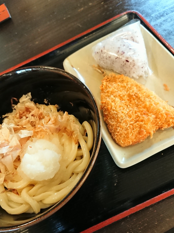 ◆ランチ:冷たい醤油ぶっかけうどん+鯵フライ+ゆかりのおにぎり