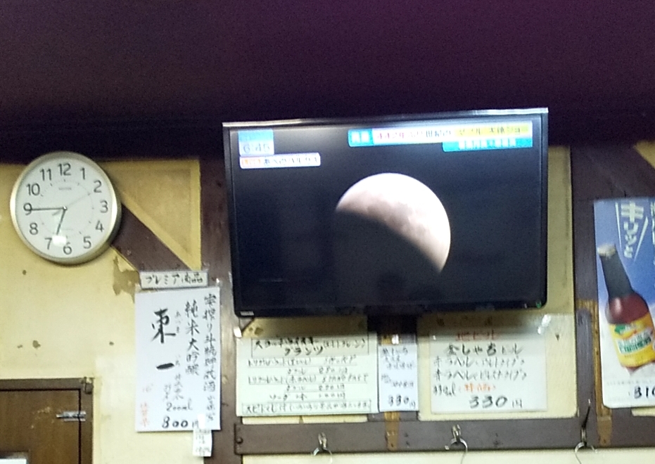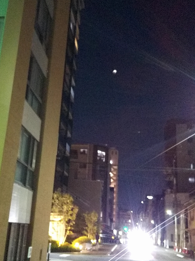 お散歩先で3杯目の黒糖焼酎飲みながらTVに映る18:45頃の月食を見たあと、19時過ぎ皆さんにサヨナラしてお店の外で見たお月様