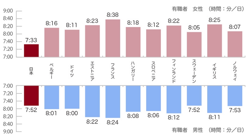 就労者の平均睡眠時間の比較の中で、日本の場合は男性が7時間52分、女性が7時間33分