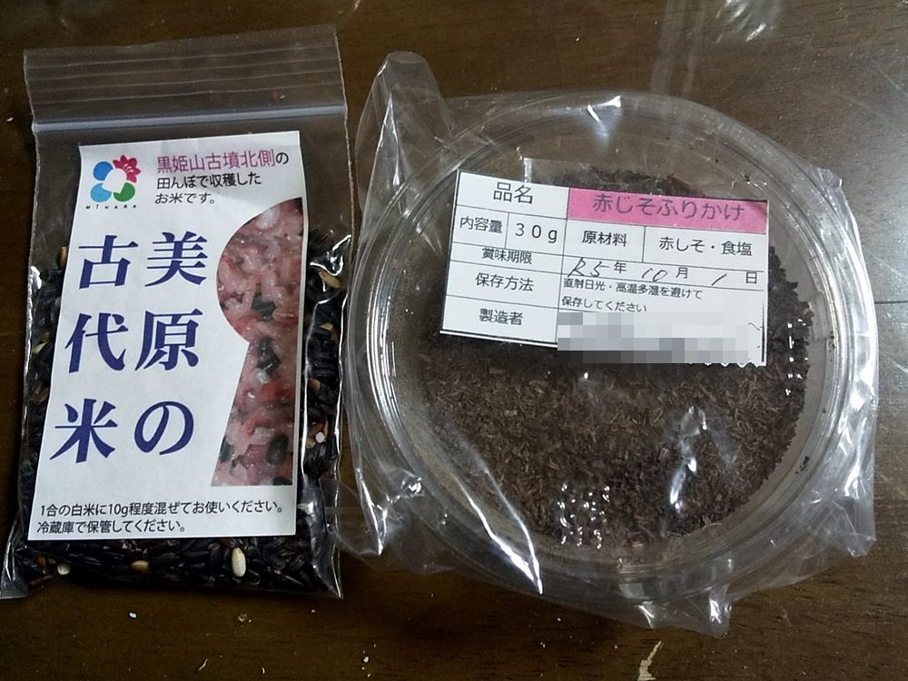 お赤飯にも見えますが、美原の古代米(美原本通り商店街振興組合)混ぜたご飯です