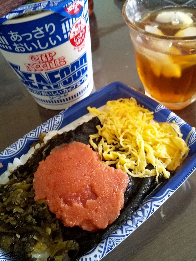帰宅後奥さん曰くこれだけでは足りないでしょうと、カップラーメンがお汁ものの代わりです