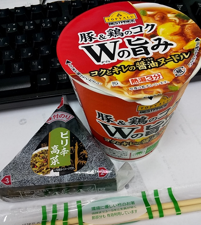 ◆ランチ:カップラーメン + 高菜おにぎり