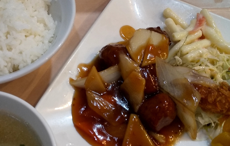 さて本日のランチは肉団子とエビフライ