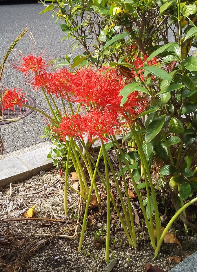 暑さ寒さも彼岸までのはずの9月秋の彼岸花が10月半ばで、1号線の脇で今頃咲いております