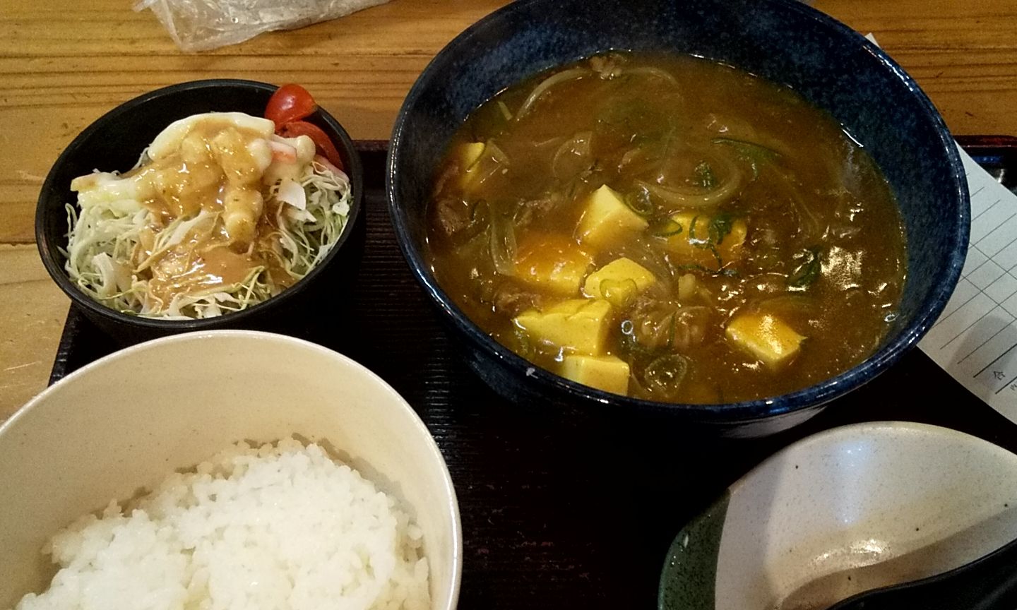 こんな日に選んだランチは、カレースープにお肉と豆腐がカタクリの熱々の餡の中にがっつり入ったカレー豆腐定食