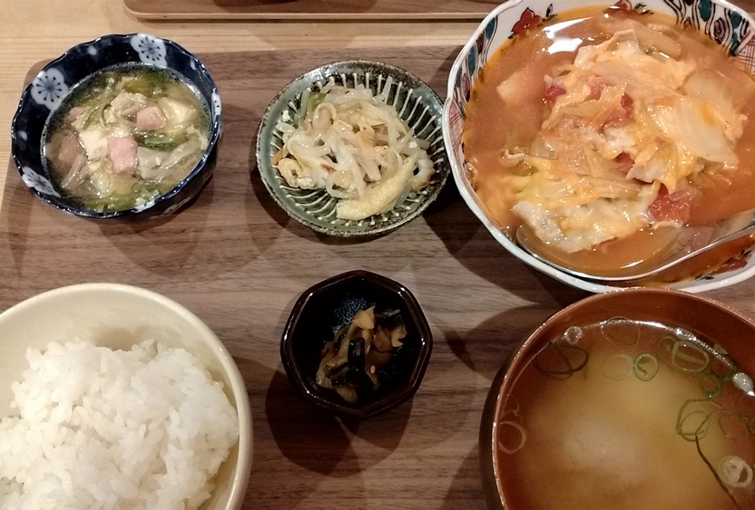 メインは豚と白菜のトマトチーズ煮、これに小鉢3品にお味噌汁、いつもの美味しい炊き立てご飯の組み合わせ