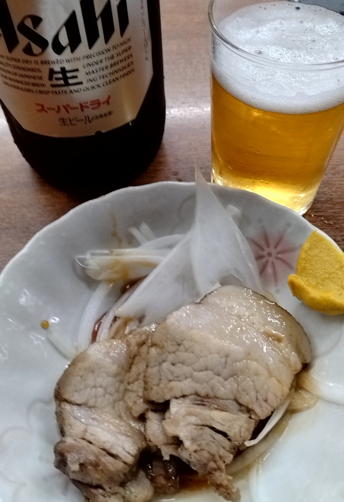 まずは蒸し豚とショウガ天を朝日の大瓶で頂いて、グラスワインで野菜と海老のかき揚げ頂きます