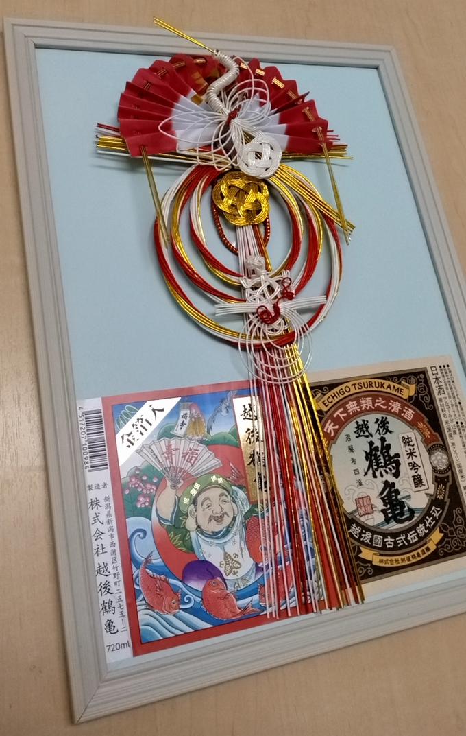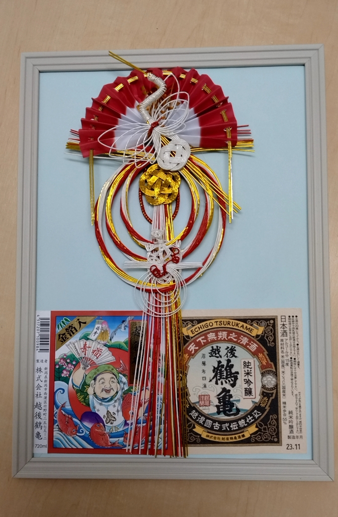 瓶の口取りに綺麗な飾り紙と帯紐で格式狙うお酒も多い中、何より蔵元さんのお名前通りの鶴亀の水引が正面を飾るのもおめでたい