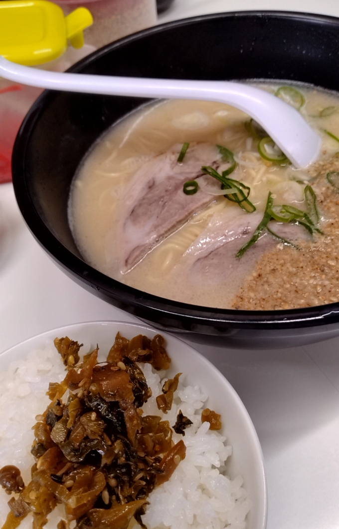 会社近くにある長浜ラーメンの一ニ三さんは、長浜ラーメンとご飯セットには、高菜がついてこれが、私には焼飯セットにもまさるご馳走セット