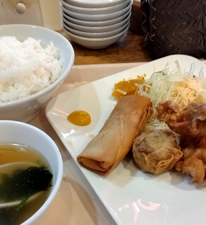 本日の日替わりランチは、春巻き・シュウマイ・鳥のから揚げ