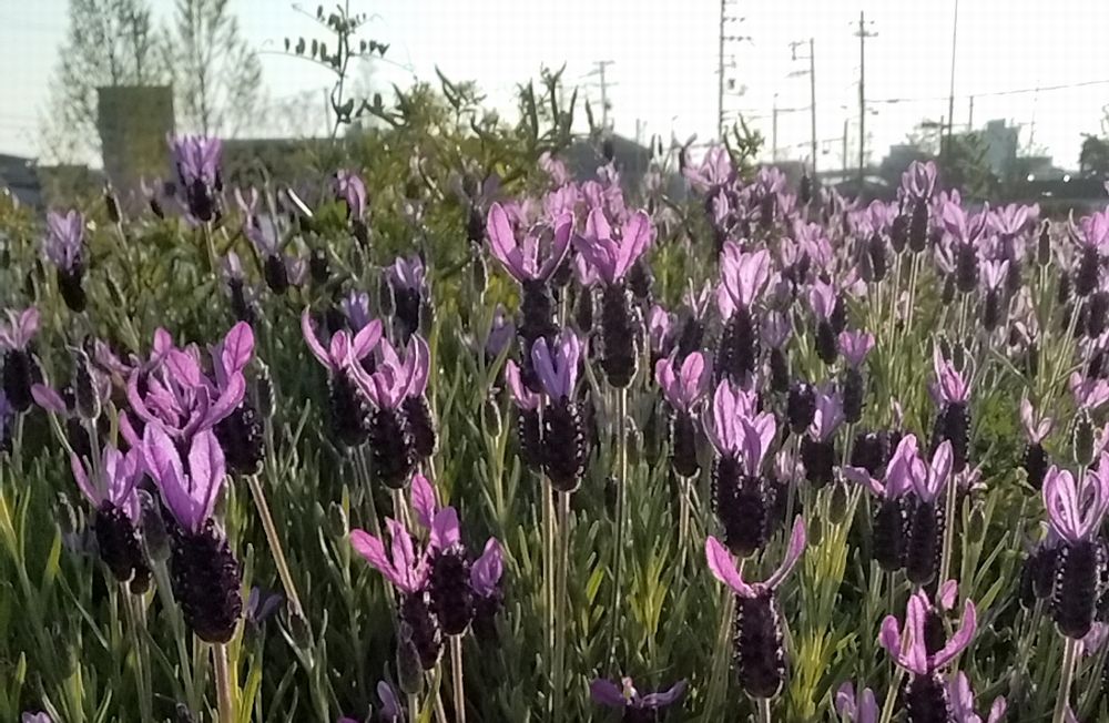 公園で見かけたフレンチラベンダーや初めて目にした赤い花はグレヴィレア