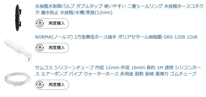 内径8mmと12mmのホースをつなぐためには、8mm ⇢ 12mm の異径ホース継手が必要、まとめて密林さんでポチしたものは到着済み