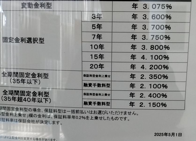 今更ですがようやく住まいの借金一括の手続きに行ったのですが、窓口に置かれた住宅金利は銀行の固定金利の7年選択と同じ3.75%の数字