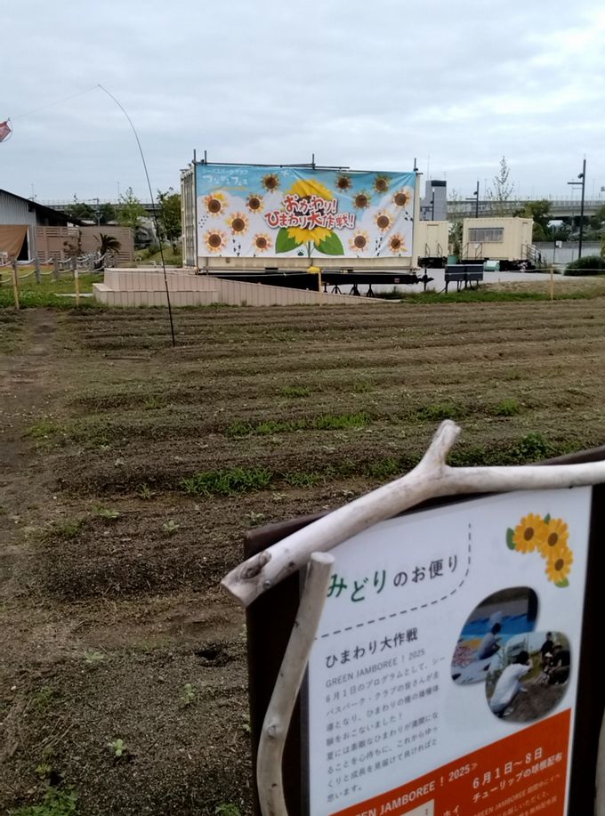 公園で先週目にしたヒマワリ畑、1週間でちろちろ目が出て順調にお育ちのご様子