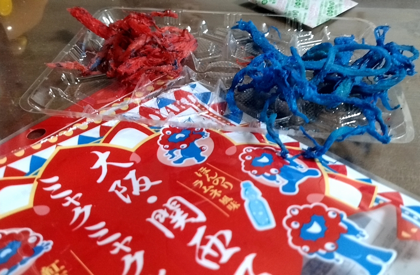 赤は紅生姜風味、青はラムネ風味で、なかなか旨い