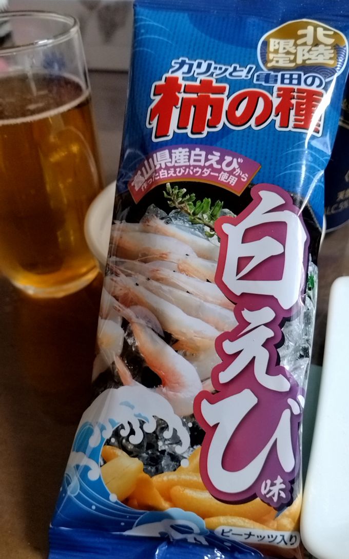 最初の肴は先週逝った北陸限定富山の白エビ使った柿の種から始めます