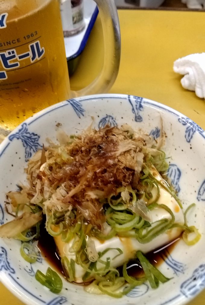 蒸し暑さにも冷ややっこの食味は衰えず、冷えたビールとの相性ピッタリ