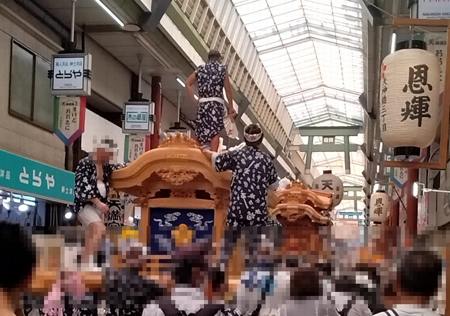 この日は天神祭りの神輿やギャルみこしが商店街を繰り出したのでいつも以上に人が多い