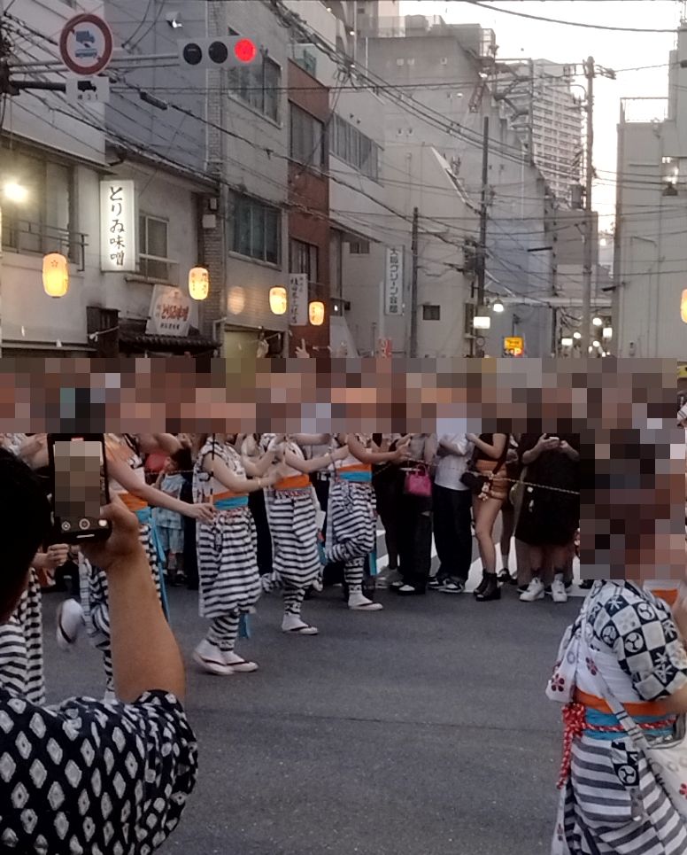 帰り道、駅まではいつも天神様の南門の通りを突き抜けるのですが、ちょうど傘踊りの団体様が行進中