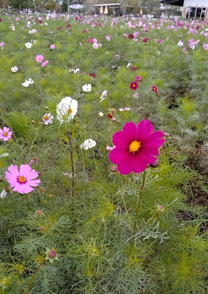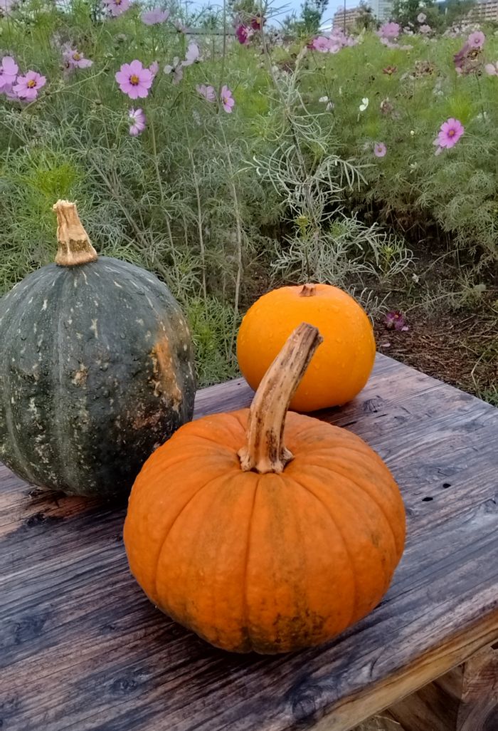 公園では秋の花のコスモスが咲きそろい昨日のハロウィンの飾り