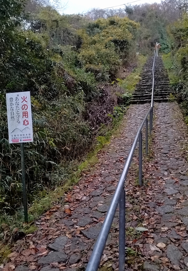 ここから急こう配の石段続きさらに落ち葉の積もってリスクの高まる道