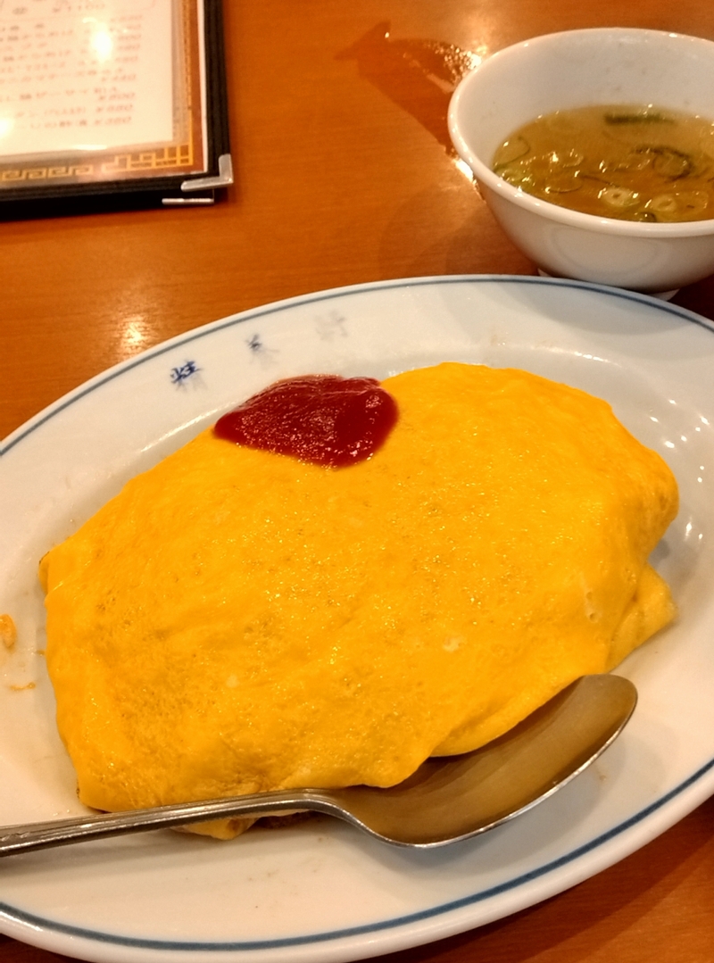 しっかりと張りのある薄焼き卵に、粗目のシャキ玉ねぎの混じったケチャップライスの仲良しコンビ