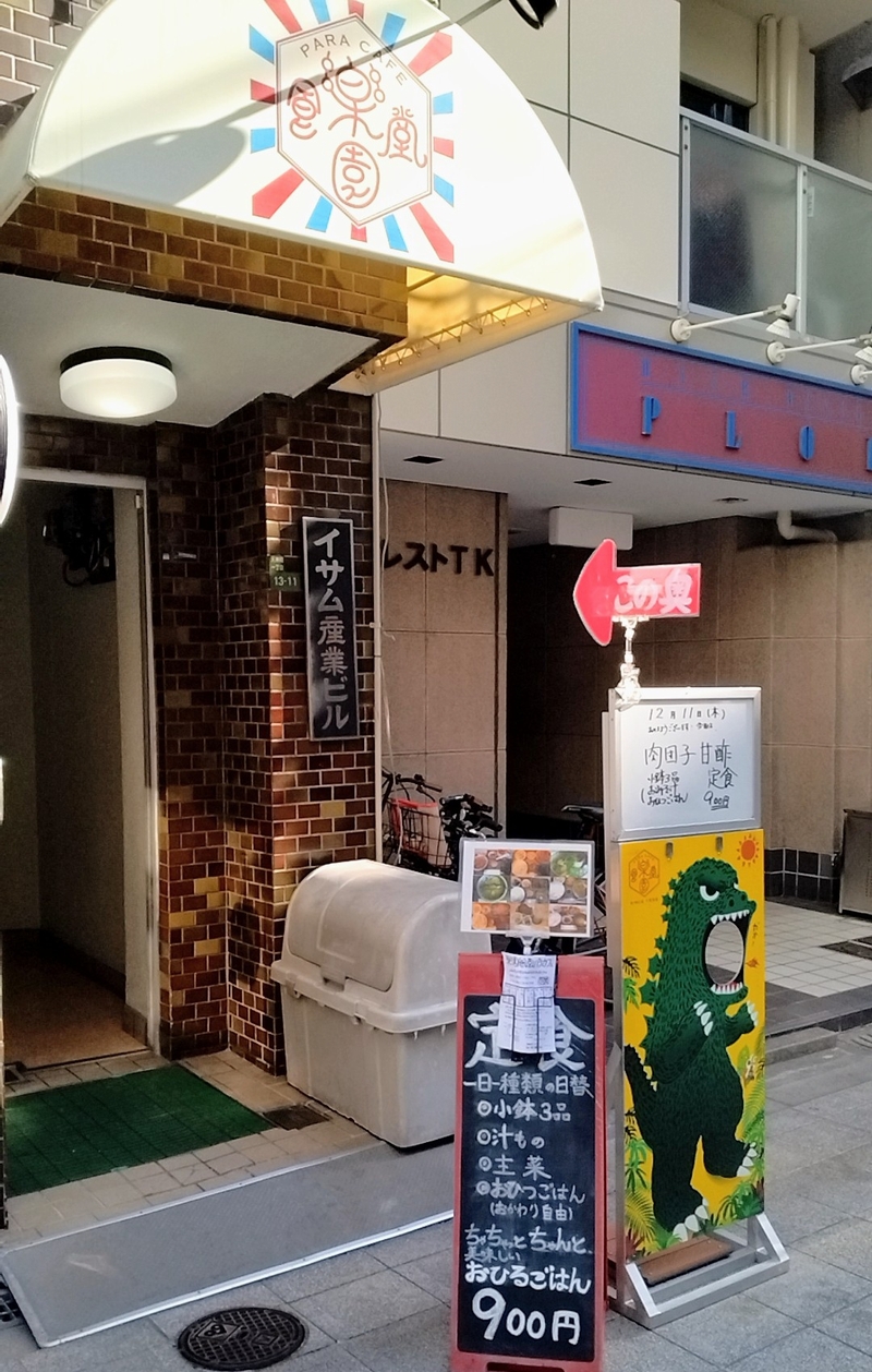 ゴジラの上に書かれた日替わりメニューは肉団子甘酢