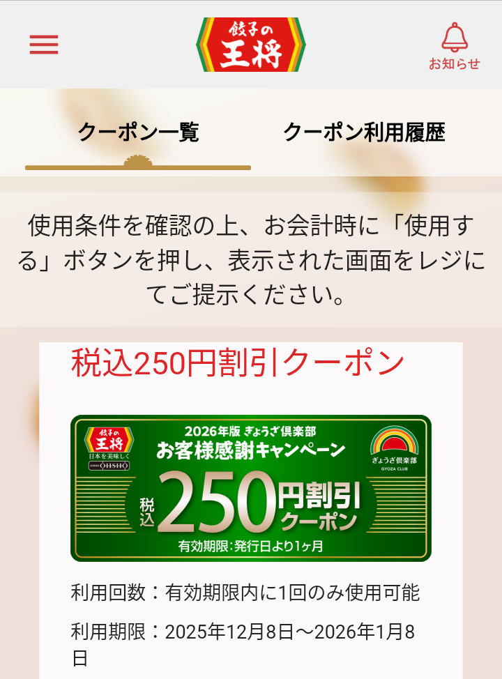次回使えるクーポン頂けると思ってましたが、アプリ画面のクーポンの項目ポチしたらクーポン券が数枚並んでおります