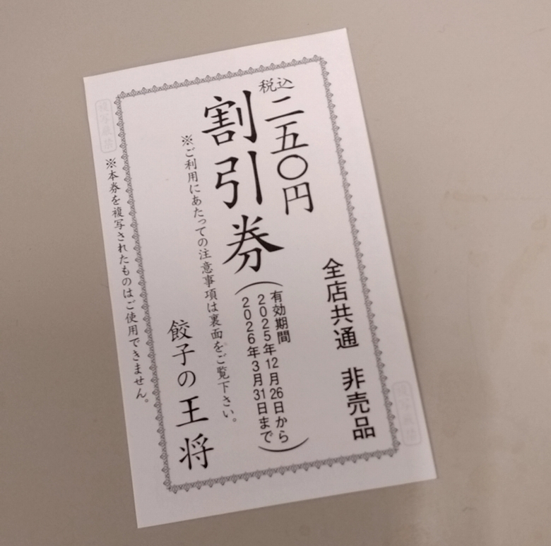 王将さんは1967年12月24日、京都四条大宮での操業を記念して24・25日は500円毎に250円割引券のお振舞キャンペーンという太っ腹