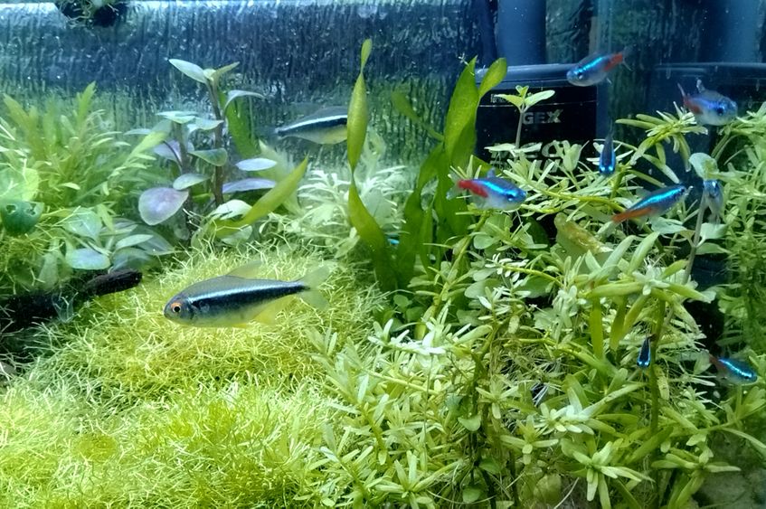最初は影に隠れておりましたが、今では数の力で10倍大きいブラックネオンテトラを威圧気味