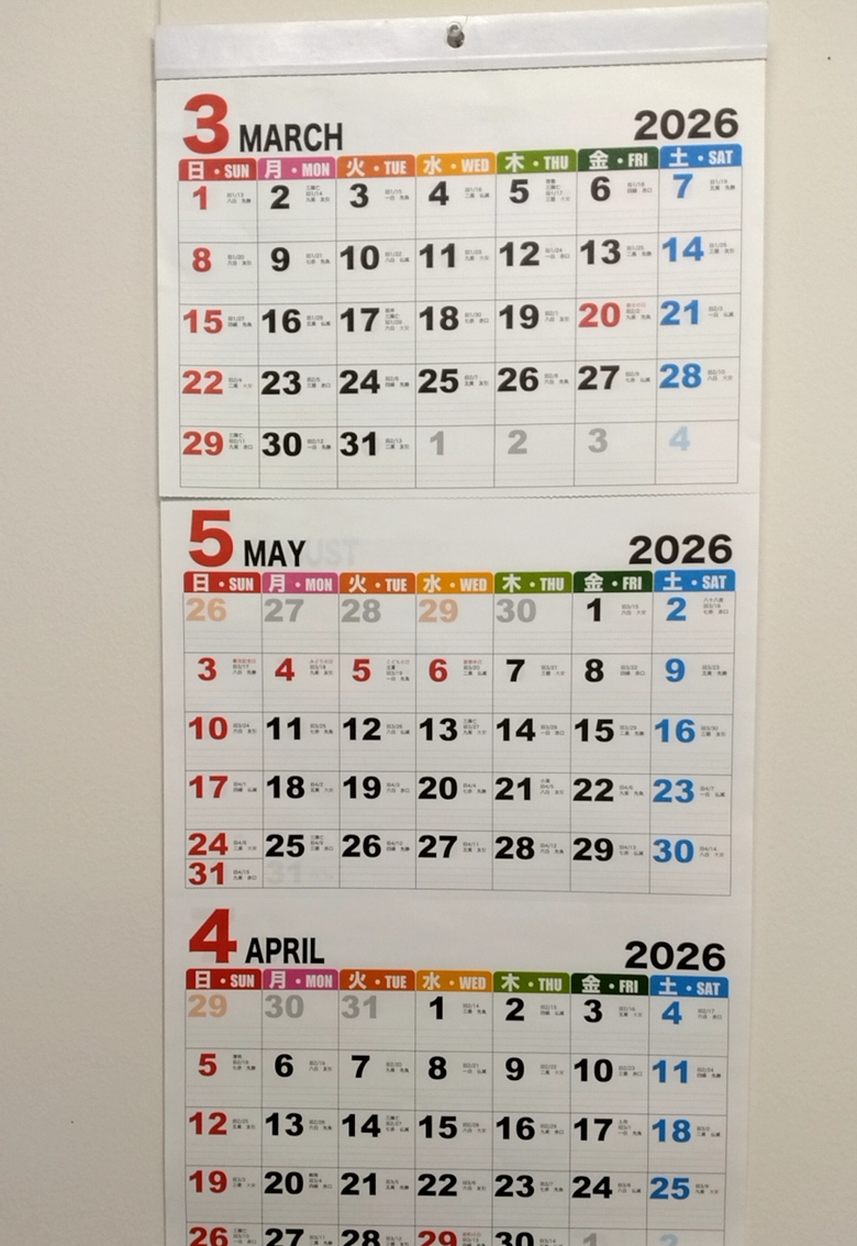 3カ月カレンダーには4月末から5月の連休が目に映ります