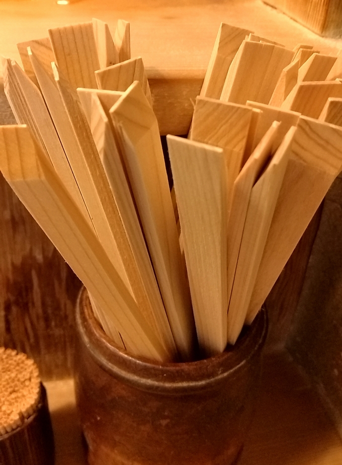 一皿づつのすし盛待つ間、目の前にあるお箸は天削箸