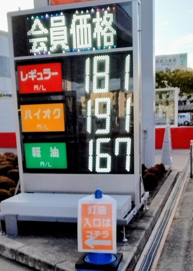 途中ガソリンスタンドで見かけた伝承ボードには会員価格レギュラー181円の価格
