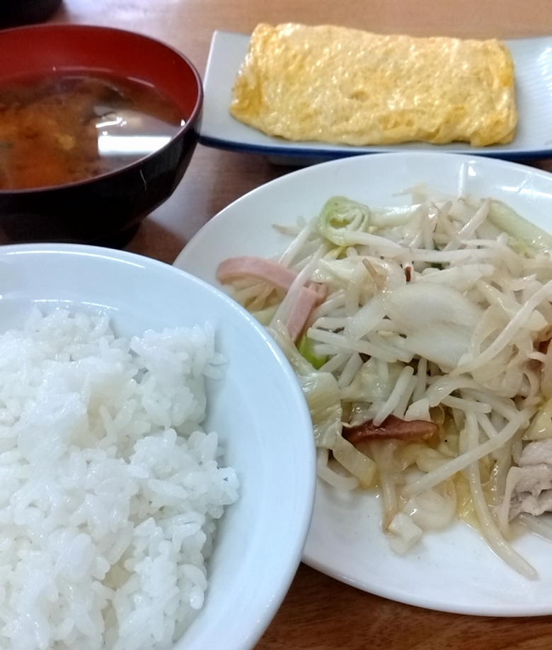 それならば探した代案メニューは、野菜炒めに出し巻き、赤だしとご飯の4点セット