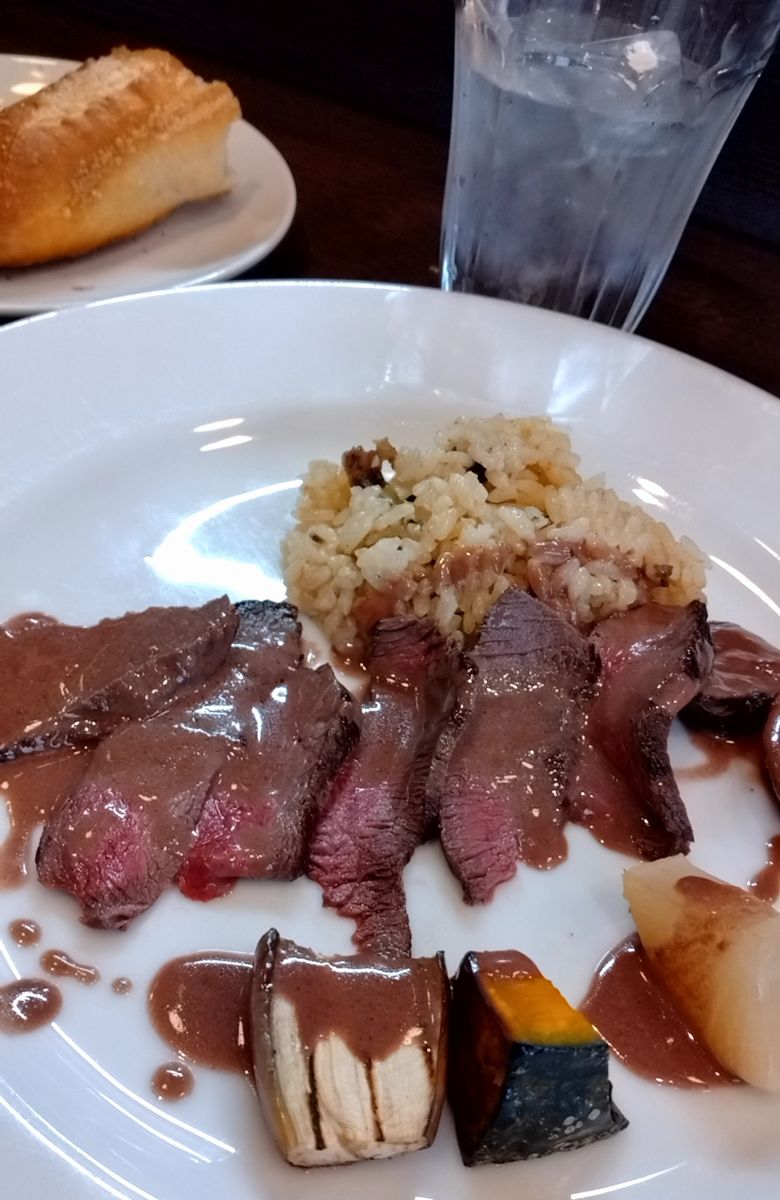 白菜ポタージュから始まり、メインのエゾシカ肉のあっさりにワインソースがこれ旨し